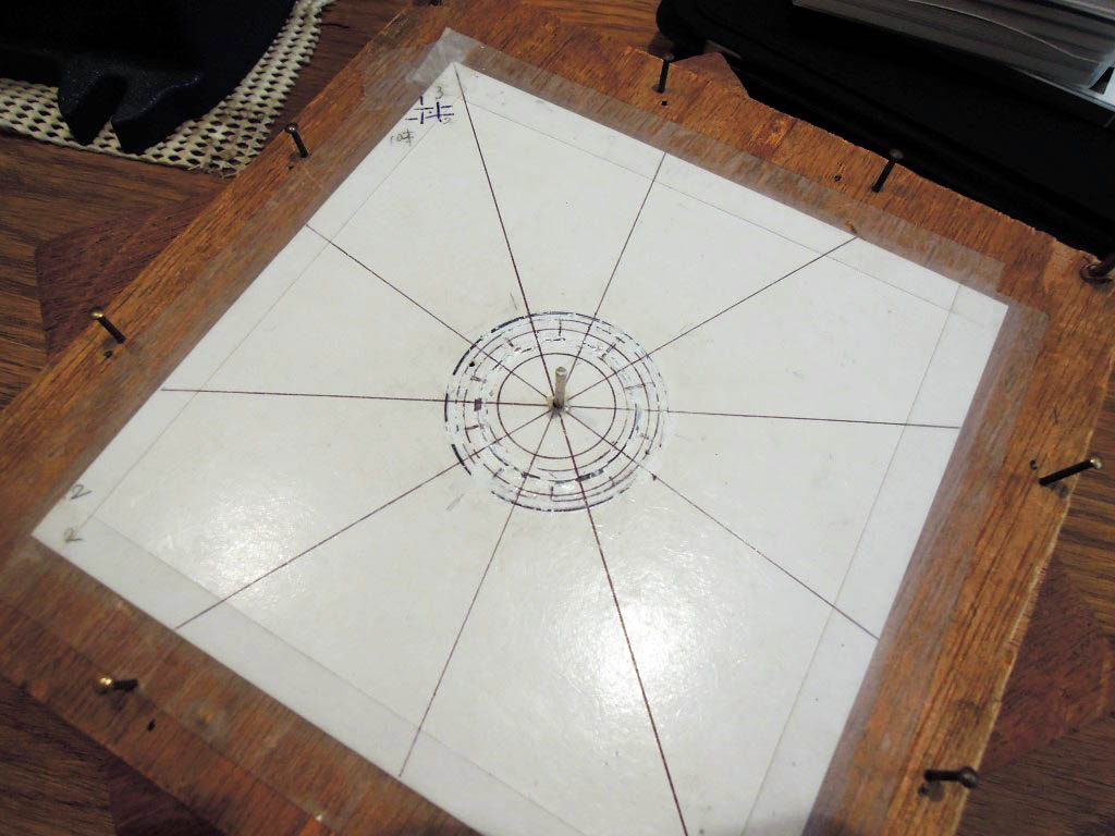 The hand-drawn template on which the base of the tea-strainer begins to take shape.
