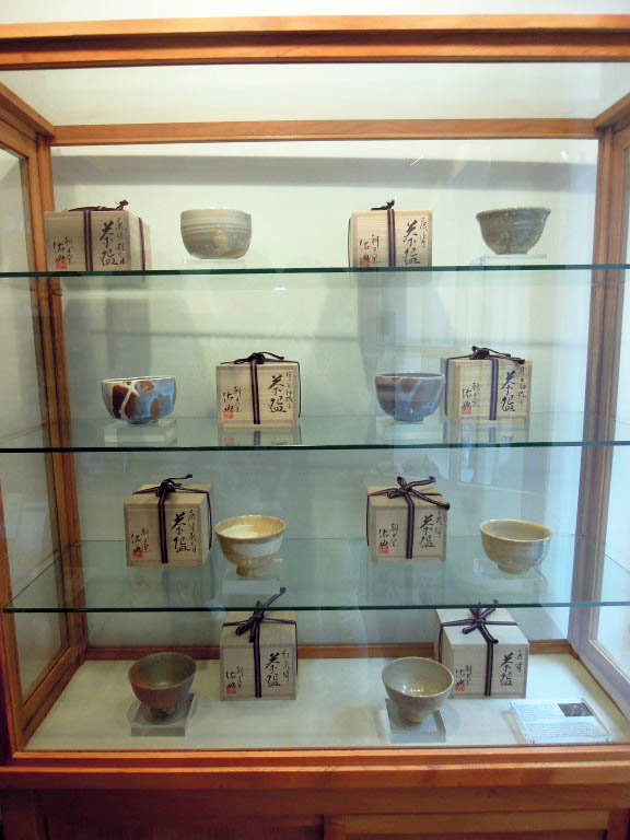 A variety of tea bowls ‘chawan’ with different glazes which were all produced at the Asahi Kiln, alongside their signed wooden boxes ‘tomobako’.