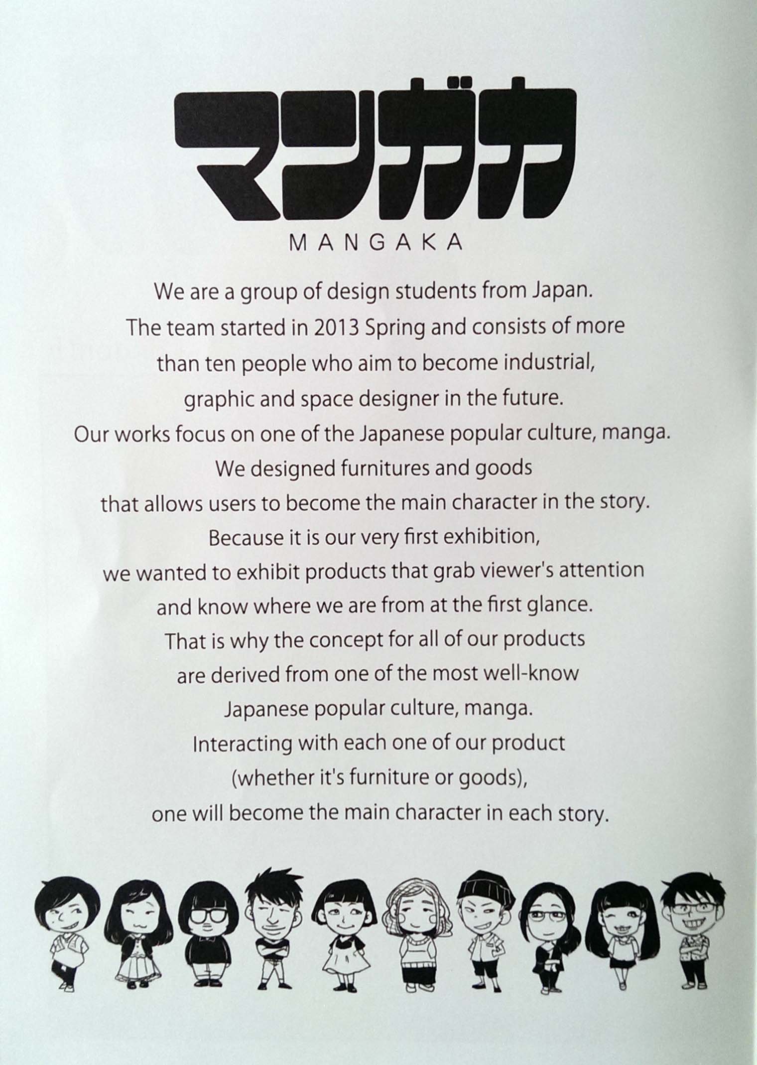 MANGAKA are a group of design students from Osaka, Japan. They all study at OMCD (Osaka Municipal College of Design), and last week they exhibited their work outside Japan for the first time ever at TENT London for London Design Week 2014. They didn’t have an easy road getting here and due to lack of funding each member had to self-fund their trip, but with an awful lot of determination, hard work and team spirit – they made it! You can find out more about their story by clicking here.