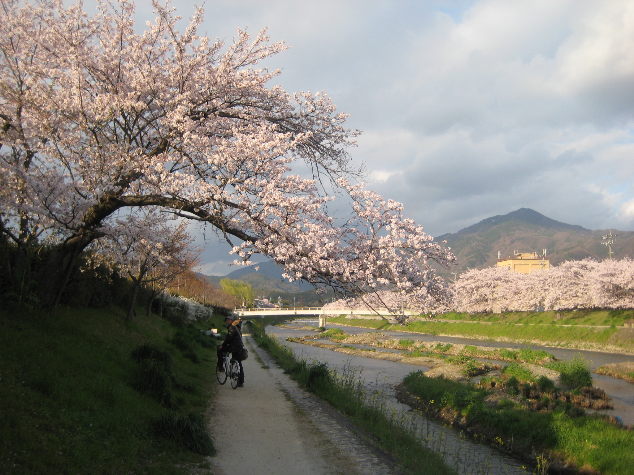 riding my bike with its little basket along the riverside path in Kyoto in the moonlight, energy levels heightened having enjoyed an evening with good friends. Riding home, at full speed, every so often hitting a bump in the path or a stray stone, and feeling the rush of trying to keep my balance rather than using my brakes.. Getting totally lost and not caring. Because I would never get tired of riding my bike through these quiet, peaceful streets, looking up at any given moment to see the magical and protective mountains surrounding the city – dark, powerful shapes looming against the night sky, crisp and clear…