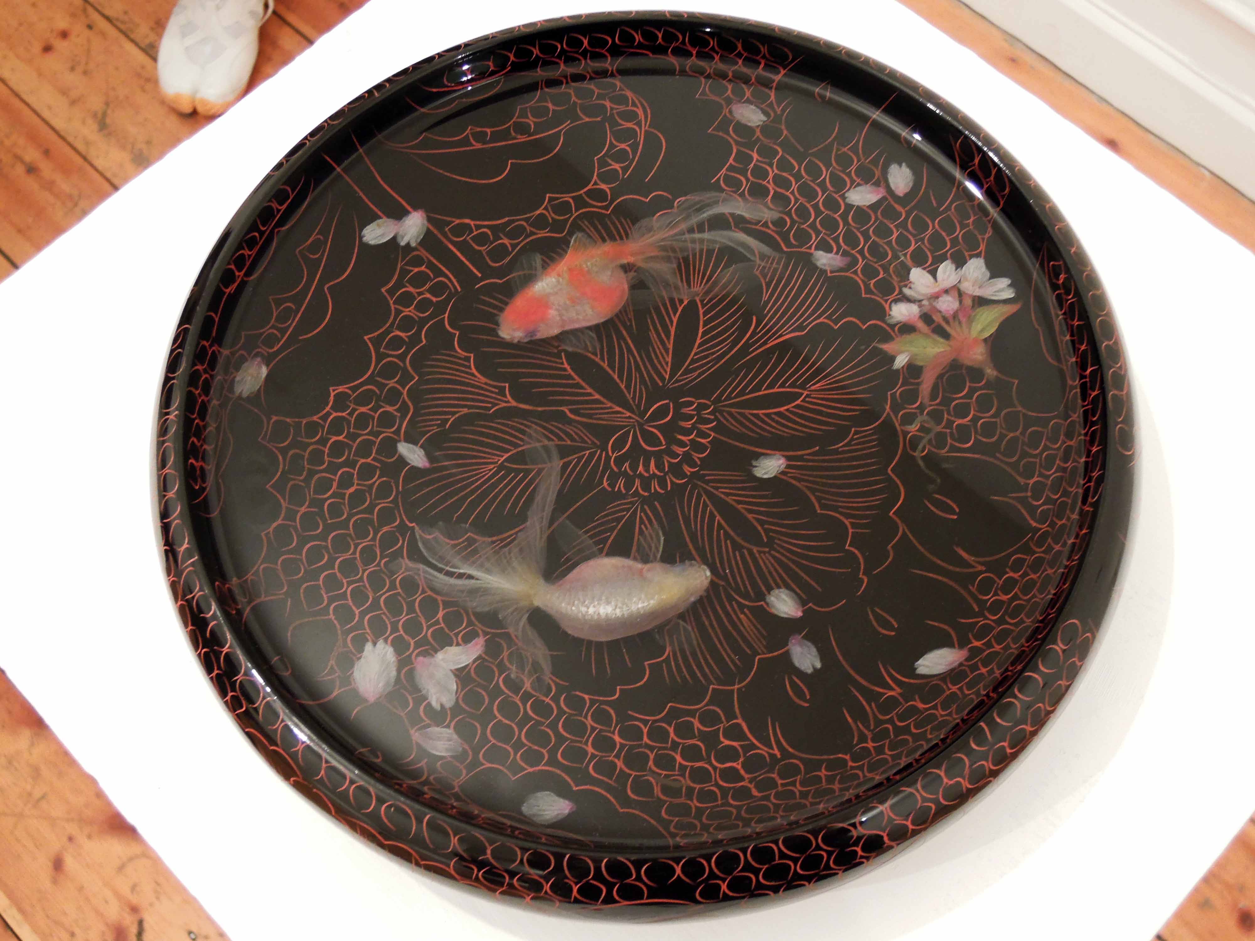 A pair of goldfish and cherry blossom petals in lacquer tray A pair of goldfish and cherry blossom petals in lacquer tray